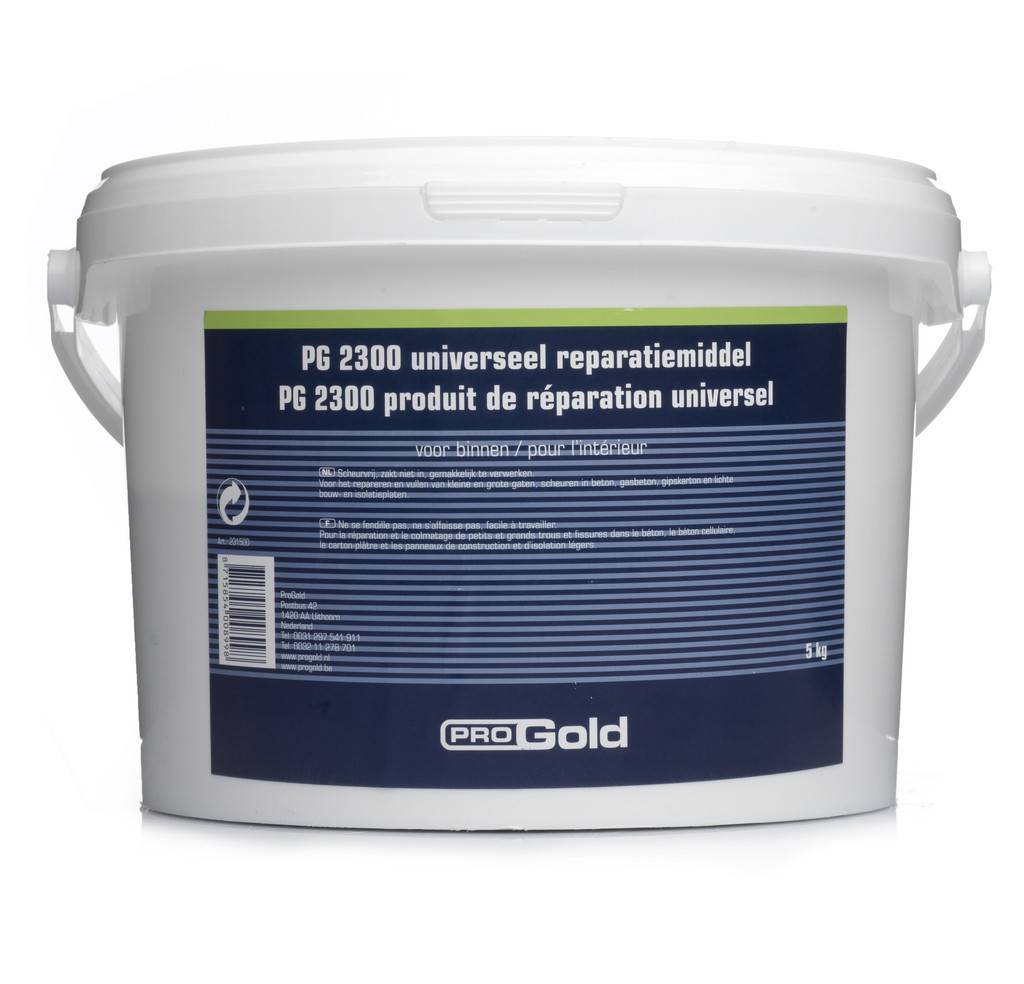 Het ProGold 2300 Universeel Reparatiemiddel is een reparatiemiddel voor binnen op basis van gips-kunststof. Het middel heeft een hoog vullend vermogen, krimpt vrijwel niet, scheurvrij en goed schuurbaar. Het middel wordt gelijkmatig hard in elke dikte. Geschikt voor het repareren en uitvlakken van ruw metselwerk, beton, cellenbeton en stucwerk voor het behangen of schilderen.