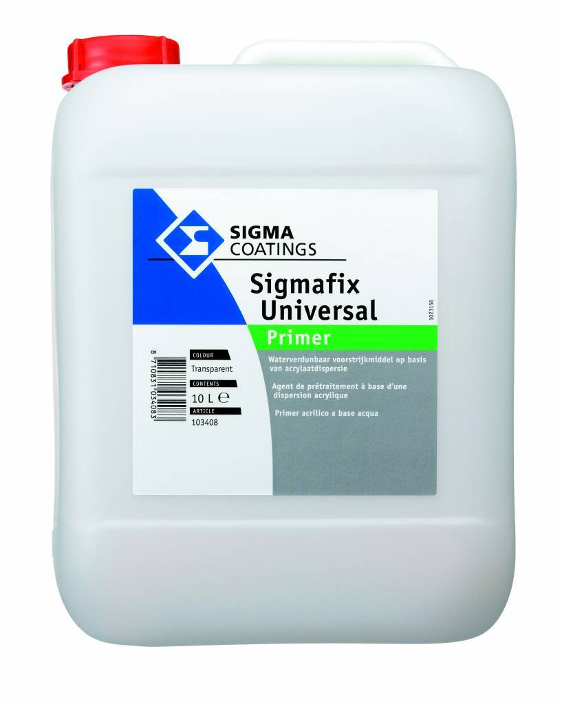 Sigmafix Universal is een watergedragen voorstrijkmiddel wat zorgt voor een goede hechting met de sigma muurverven, daarnaast voorkomt het glansbontheid. Toe te passen op zuigende en licht poederende ondergronden zowel binnen als buiten. Kan in de verhouding 1;4 verdund worden.
